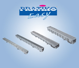 Drainage channels are the best solution for linear drainage systems. The PRATIKO line is made of PVC modular channels, whereas PRATIKO-Easy and PRATIKO-XL lines are made of Polypropylene; all channels are equipped with accessories (angles, drainage joints, drainage heads) to allow customization and optimize connection with evacuation water networks; channels are implemented by a wide range grids and covers both for pedestrian and heavy traffic use, in PVC, PP, cast iron, metal and reinforced glass fiber nylon. PRATIKO and PRATIKO-XL modular channels, grids and covers are CE marked according to norm UNI EN 1433: 2008.